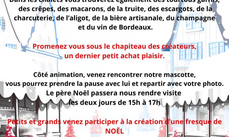 Dans les chalets vous trouverez également des tourtous garnis, des crêpes, des macarons, de la truite, des escargots, de la charcuterie, de la bière artisanale, du champagne et du vin de Bordeaux.