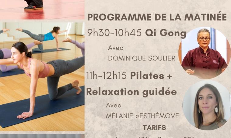 09h30/10h45 Qi Gong avec Dominique Soulier - 11h00/12h15 : Pilates + Relaxation guidée avec Melanie Esthémove - Tarifs : 1 h/12 € - 2 cours : 20 € - Adhérents Activ'Santé : 6 € le cours - Tapis non fourni - Plais conseillé pour la relaxation -