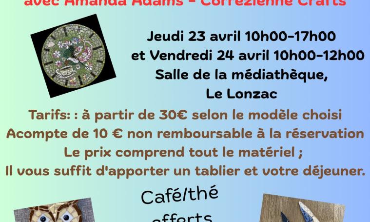 Atelier de Mosaïque - Tarif : 30 € selon le modèle choisi - Le prix comprend tout le matériel - Il vous suffit d'apporter un tablier et votre déjeuner