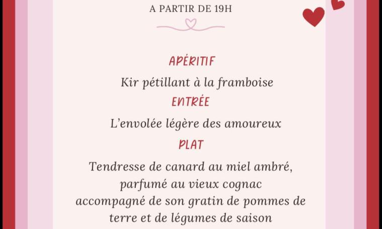 Pour la soirée placée sous le signe de l’amour, le chef vous propose un menu de mets délicats créés tout spécialement pour vous.