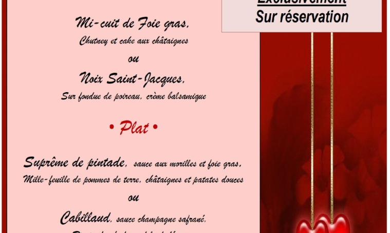Menu : Entrée : Mi-cuit de foie gras, chutney et cake aux châtaignes ou Noix de Saint-Jacques, sur fondue de poireau, crème balsamique - - Plat : Suprême de pintade, sauce aux morilles et foie gras, mille-feuille de pommes de terre, châtaignes et patates douces ou Cabillaud, sauce champignons safrané riz parfumé, farandole de légumes. Dessert : Entremet caramel-mange-coco - Tarif : 40 €