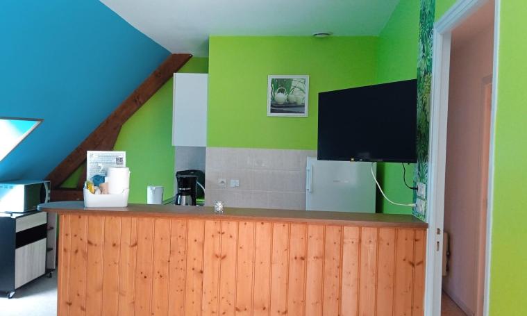 Gîte à l'étage avec entrée indépendante avec accès par un escalier extérieur, aménagé dans un ancien corps de ferme rénové en 5 gîtes, en bordure d'un plan d'eau avec terrain commun aménagé non clos (environ 7000 m2). Gîte mitoyen avec le gîte n°1 qui est situé au-dessous. Cet appartement se compose de 2 chambres avec 1 lit 140 et 2 lits 90 (pouvant être rapprochés et former 1 lit 180). Séjour avec canapé convertible et cuisine équipée, lave-vaisselle, lave-linge. WIFI-Télévision 4K. Un Kit de ménage avec des produits éco-responsables vous sera fourni. Petite terrasse avec banc et table d'extérieur. Barbecue. Équipement bébé gratuit sur réservation. Animaux acceptés sous la responsabilité de leur propriétaire, dans le respect du gîte et des autres résidents. Accès à la plage à 50m et au parc sport loisirs avec un city-stade et une aire de jeux pour enfants. La pêche au plan d'eau des ...