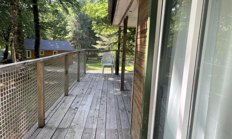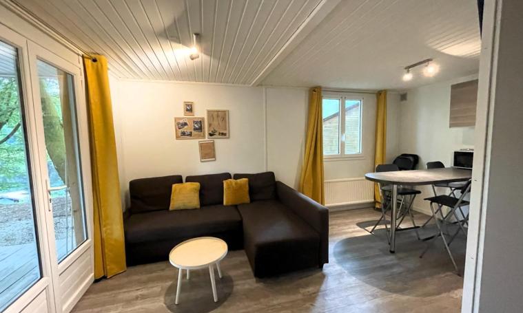 Accessible par une seule petite marche, ce cottage de type "VACANCES" de 48 m² dispose de deux chambres : l'une avec un lit de 140 cm et une douche à l'italienne avec toilettes communes, et l'autre avec deux lits de 80 cm, une douche à l'italienne et un WC indépendant. L'espace de vie lumineux comprend une cuisine ouverte équipée d'un plan snack, de trois meubles de rangement, d'un évier, d'une plaque de cuisson à 4 feux au gaz avec hotte, d'un réfrigérateur, d'un micro-ondes, d'une cafetière à filtre ainsi que de la vaisselle et des ustensiles. Cet espace se prolonge par un coin repas et un salon avec canapé convertible 2 places, tables basses et TV. À l'extérieur, profitez d'une terrasse en bois semi-couverte, d'un salon de jardin et d'un hamac sous les arbres pour vous détendre. - Deux entrées indépendantes - Linge de lit et serviettes de toilette fournis - Une connexion Internet d'un demi méga gratuite et illimitée pour un appareil par hébergement