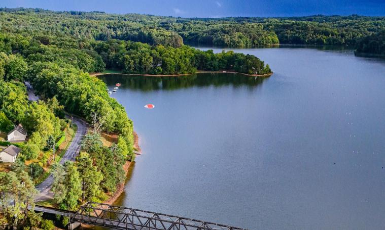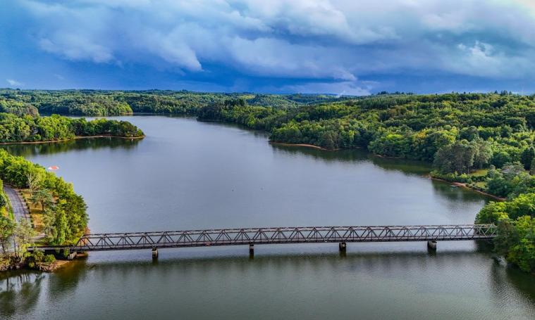 Ancien pont de chemin de fer utilisé pour le passage du Tacot Tulle-Ussel. Ce pont-cage métallique de 207m de long ne fut construit qu'en 1949 au environs de Marcillac à cause de la construction du barrage de la Vallette qui recouvrit l'ancien tracé du Transcorrézien de 15 m d'eau sur 5 km. Auparavant, le train franchissait le Doustre (affluent de la Dordogne) sur un petit pont de pierre (que l'on peut encore voir lorsque EDF vide la retenue). Il sert aujourd'hui de pont routier.