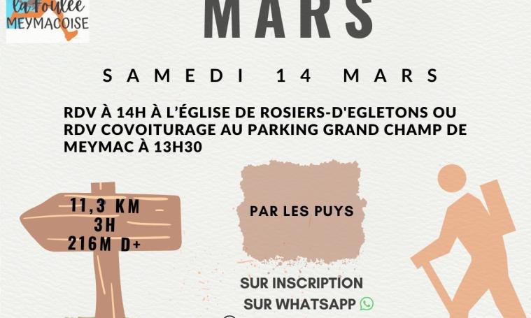 Randonnée "par les puys" (11,3km - 3h) au départ de Rosiers d'Egletons . RDV à 14h devant l'église de Rosiers d'Egletons ou RDV à 13h30 sur le parking Grand champ de Meymac pour du covoiturage. Tarif : 2€, gratuit pour les adhérents de La foulée meymacoise. Sur inscription.