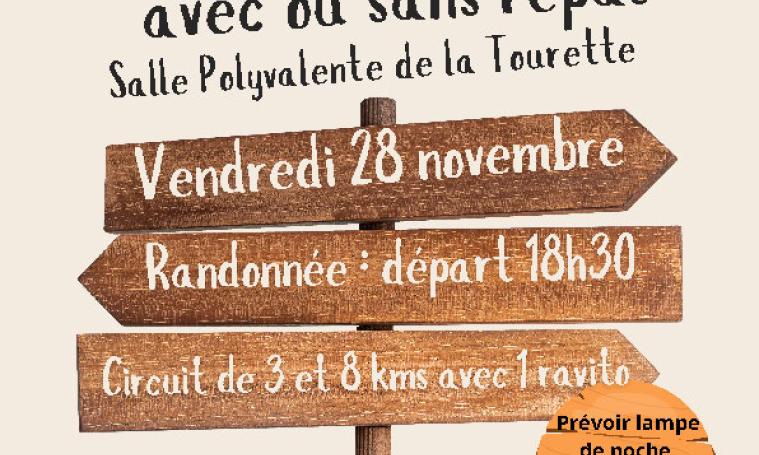 Le Comité des Fêtes de La Tourette organise une randonnée nocturne avec ou sans repas au départ de la salle polyvalente de La Tourette.