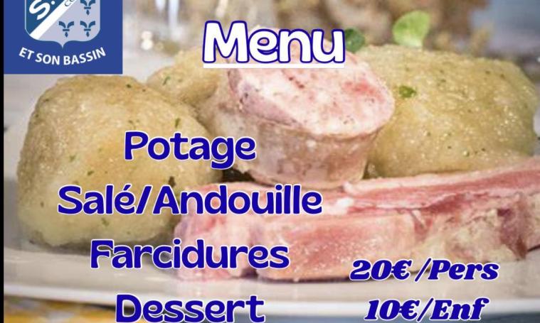 Menu : Potage, salé/andouille, farcidures, dessert - 20€/pers - 10€/pers (enfant -de 10 ans)