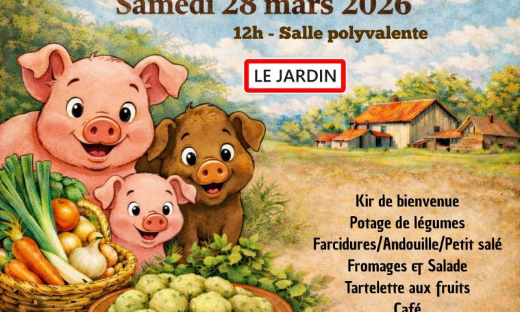 Venez passer un moment convivial à la salle polyvalente dans le bourg du Jardin. Repas farcidures avec un kir de bienvenue, potage de légumes, farcidures/andouillette/petit salé, fromages et salade, tartelettes aux fruits et café.