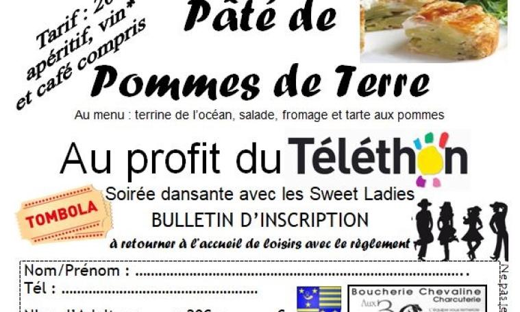 Soirée patté de pomme de terre ( terrine de l'océan, salade, fromage et tarte aux pommes ) 20 € apéritif, vin et varé compris au profit du Téléthon, soirée dansante avec les Sweet Ladies bulletin d'inscription à retourner à l'accueil de loisirs avec le règlement