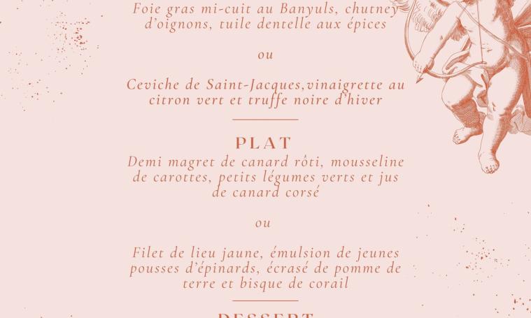Menu : Amuse-bouche - Foie gras mi-cuit au Banyuls, chutney d'oignons, tuile dentelle aux épices ou Ceviche de Saint-Jacques, vinaigrette au citron vert et truffe noire d'hiver - Demi magret de canard rôti, mousseline de carottes, petits légumes verts et jus de canard cordé ou Filet de lieu jaune, émulsion de jeunes pousses d'épinards, écrasé de pomme de terre et bisque de corail - Douceur au chocolat noir avec un praliné maison à la pistache - Tarif : 70 €