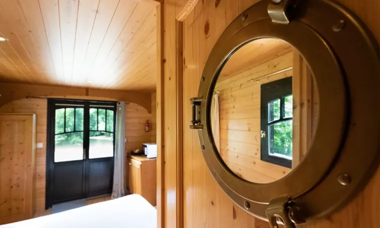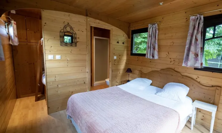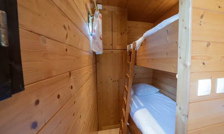 Un intérieur chaleureux composé d'un grand lit double et les deux lits superposés, les deux espaces sont séparés par une cloison pour un maximum d’intimité, une agréable salle d’eau vient compléter l’hébergement. Comme à l’hôtel, un coin thé & café est à disposition. Le chauffage électrique pour des nuits bien au chaud à l’arrière-saison.