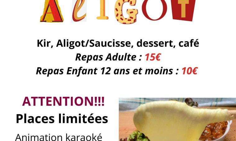 Kir, aligot/saucisse, dessert, café - repas adulte : 15€, repas enfant 12 ans et moins : 10€