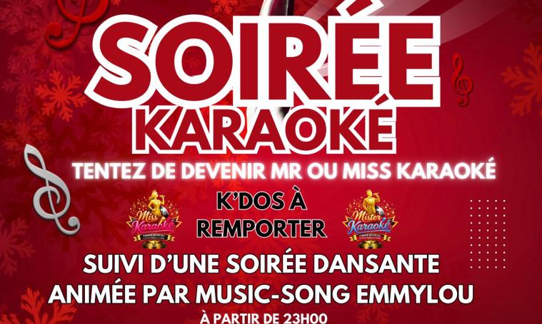 Soirée Karaoké, tentez de devenir Mr ou Miss karaoké - K'Doc à remporter - Tarif tapas : 10 € / 8 € adhérent - Suivi d'une soirée dansante animé par usic Song Emmylou à partir de 23 h -