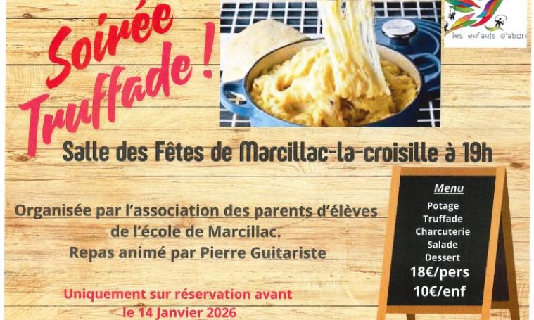 Soirée organisée par l'Association des parents d'élèves de l'école de Marcillac-la-Coisille, repas animé par Pierre Guitariste, sur réservation avant le 10 janvier.