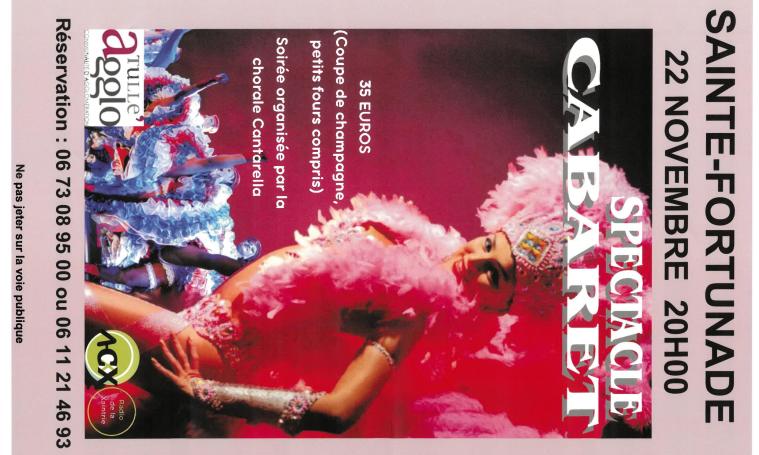 Spectacle cabaret - Tarif : 35 € (coupe de champagne, petits fours). Soirée organisée par la chorale Cantarella -