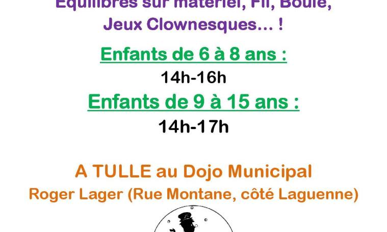 Au programme : Acrobaties, jongleries, équilibres sur matériel, fil, boule, jeux clownesques…! Enfants de 6 ans à 8 ans : de 14 h à 18 h - 15€/Apm et 60 €/4 Apm - Enfants de 9 à 15 ans de 14 h à 17 h - 22€/a pm et 85€/4 a pm - Prévoir une bouteille d'eau, une tenue souple et un goûter. Stage sans présence des parents après la phase de timidité.