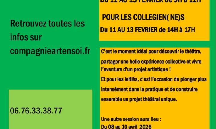 C'est le moment idéal pour découvrir le théâtre, partager une belle expérience collective et vivre l'aventure d'un projet artistique ! Et pour les initiés, c'est l'occasion de plonger plus intensément dans la pratique et de construire ensemble un projet théâtral unique. Deux autres sessions auront lieu : du 11 au 13 février : pour les enfants à partir de 7 ans de 9 h à 12 h- Pour les collègien(ne)s de 14 h à 17 h - Tarif : 135 € si l'enfant s'engage sur les 3 sessions ou 50 € par session individuelle - Adhésion saison scolaire : 8 € -