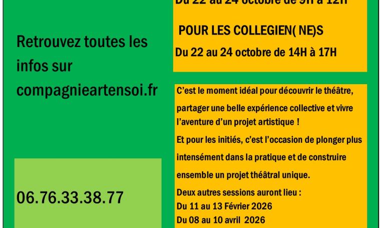 C'est le moment idéal pour découvrir le théâtre, partager une belle expérience collective et vivre l'aventure d'un projet artistique ! Et pour les initiés, c'est l'occasion de plonger plus intensément dans la pratique et de construire ensemble un projet théâtral unique. Deux autres sessions auront lieu : du 11 au février 2026 et du 08 au 10 avril 2026 - Tarif : 135 € si l'enfant s'engage sur les 3 sessions ou 50 € par session individuelle - Adhésion saison scolaire : 8 € -
