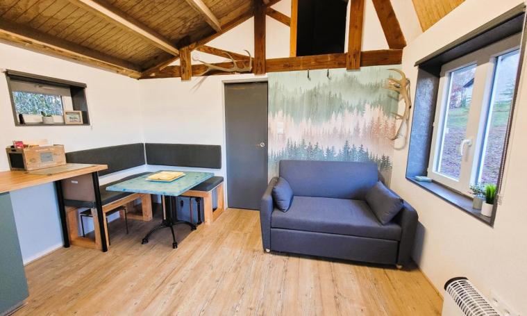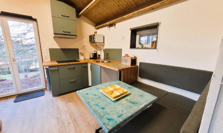 Vous commencerez par admirer la vue sur le lac, avant de découvrir la terrasse en bois de la tiny house. À l'intérieur, un séjour confortable vous attend, aménagé avec une table, une banquette, une télévision et le WIFI. La cuisine est entièrement équipée : réfrigérateur, plaque à induction, hotte, micro-ondes combiné, machine à café à dosettes (Dolce Gusto), bouilloire et un petit poêle à bois qui chauffe efficacement. La chambre est pourvue de deux lits de 80 cm qui peuvent être rapprochés. La salle d'eau dispose d'une cabine de douche munie de jets d'hydromassage, d'un lavabo, d'un sèche-cheveux, ainsi que d'un lave-linge et de toilettes.